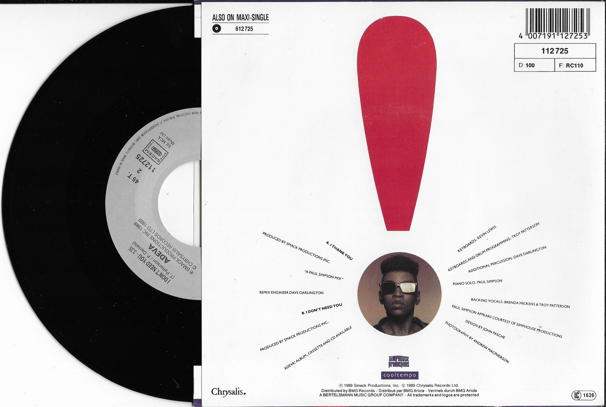 Sorti en 1989, ce 45 tours d'Adeva met en lumière le titre "I Thank You", extrait de son premier album éponyme. Véritable icône de la scène House et Garage du New Jersey, la chanteuse livre ici une performance vocale puissante et habitée, soutenue par une production club énergique caractéristique de la fin des années 80.