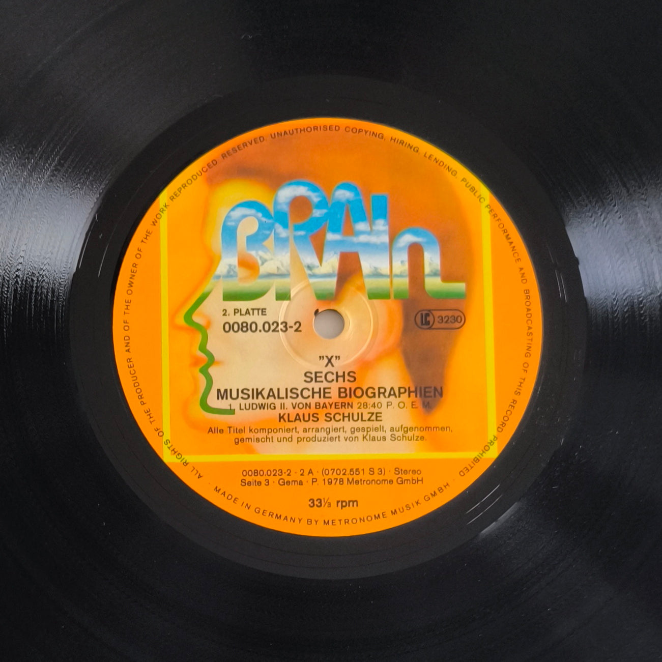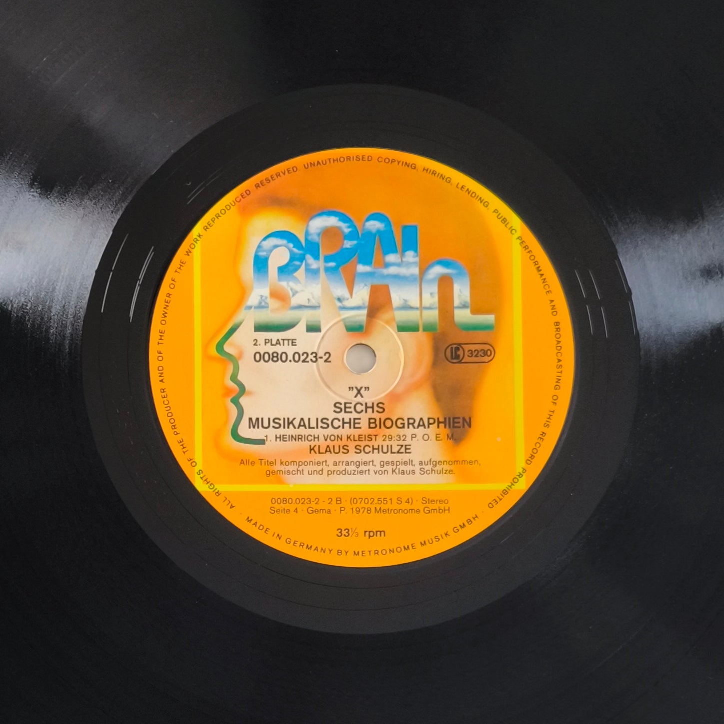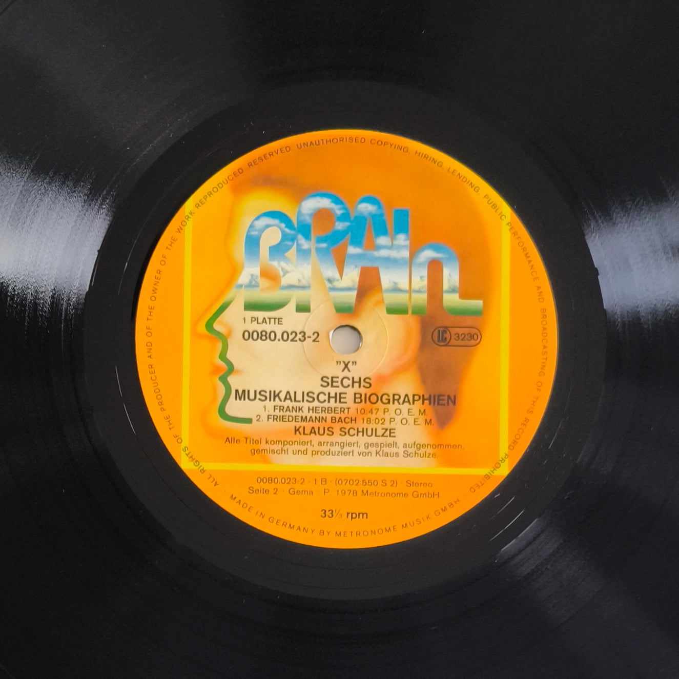 Sorti en 1978, X est une œuvre monumentale. Klaus Schulze y mélange ses séquences de synthétiseurs hypnotiques avec des éléments d'orchestre classique. C'est un voyage sonore dense, sombre et grandiose. Le pressage allemand sur le label Brain (le label culte du Krautrock) est la référence absolue pour cet album : la qualité de pressage germanique permet de restituer toute la finesse des nappes de cordes et des percussions.