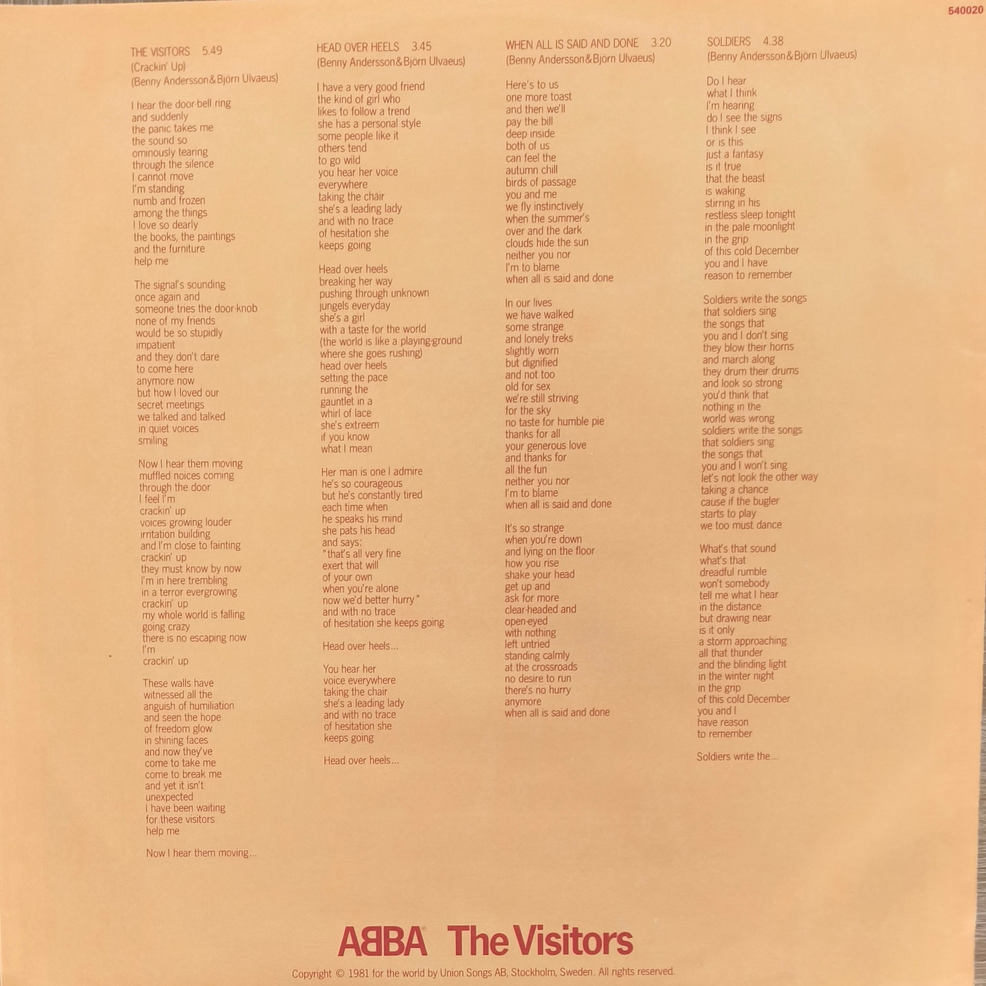 Sorti en 1981, cet album occupe une place particulière dans l'histoire de la musique pop. Dernier album studio du groupe avant leur longue pause, il marque une évolution vers des sonorités plus sombres, matures et synthétiques. The Visitors est également célèbre pour être l'un des tout premiers albums de l'histoire à avoir été enregistré et mixé numériquement, offrant une précision sonore qui a révolutionné les standards de production de l'époque.