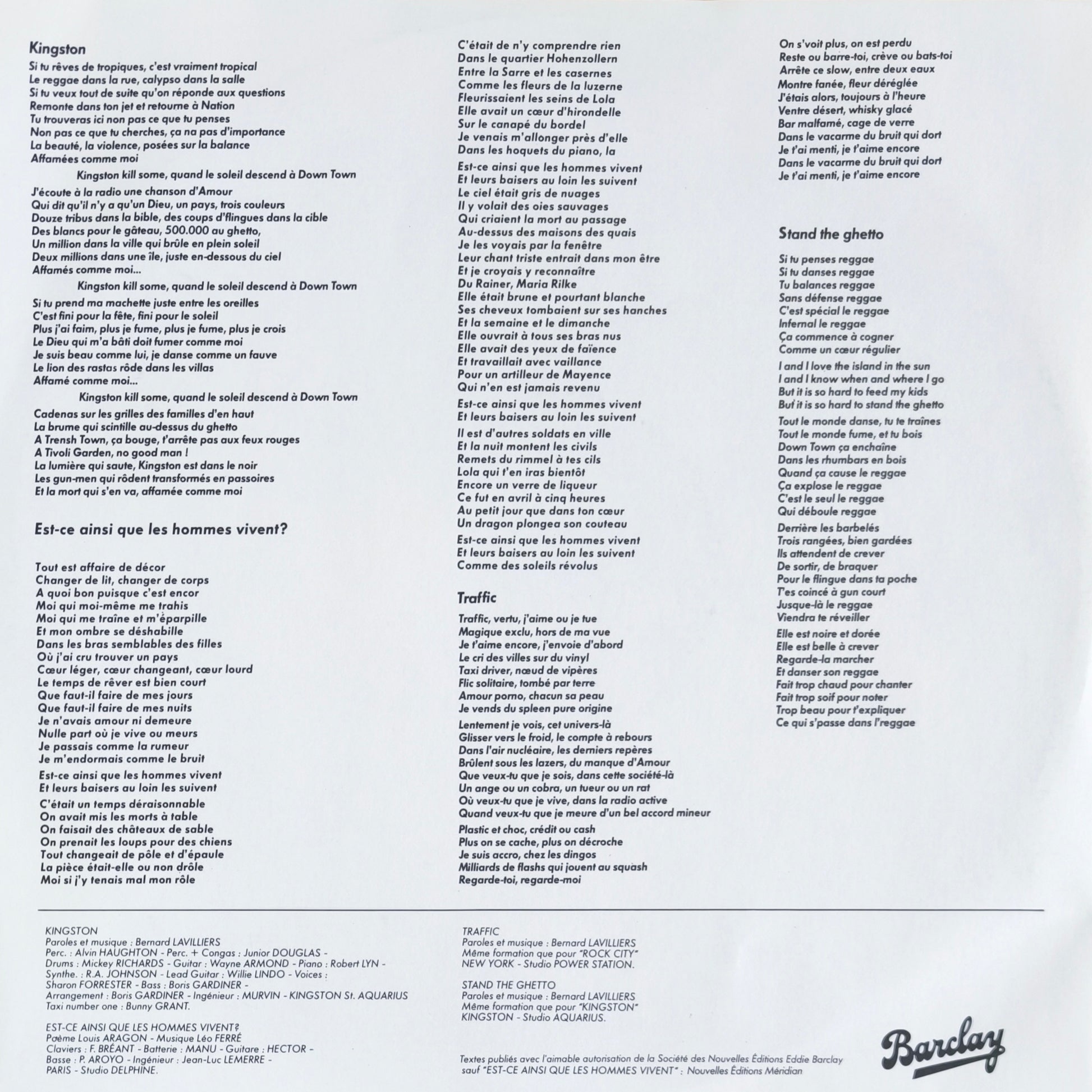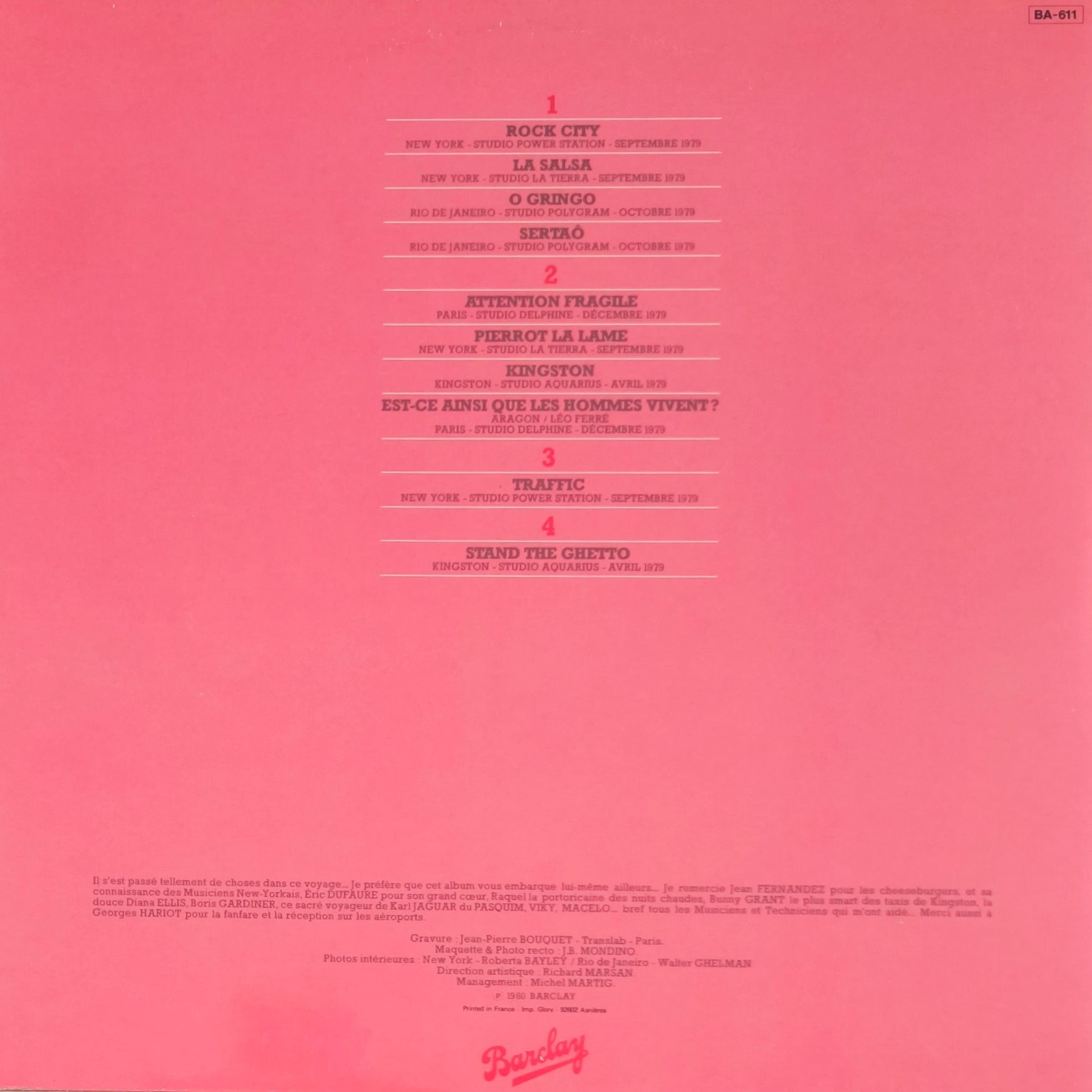 C'est ici que Lavilliers impose son style unique : un mélange de poésie brute, de rock, de salsa et de reggae. L'album contient certains de ses plus grands succès, dont l'inoubliable Traffic, Stand the Ghetto (enregistré au studio de Bob Marley) et la ballade mélancolique La Salsa.