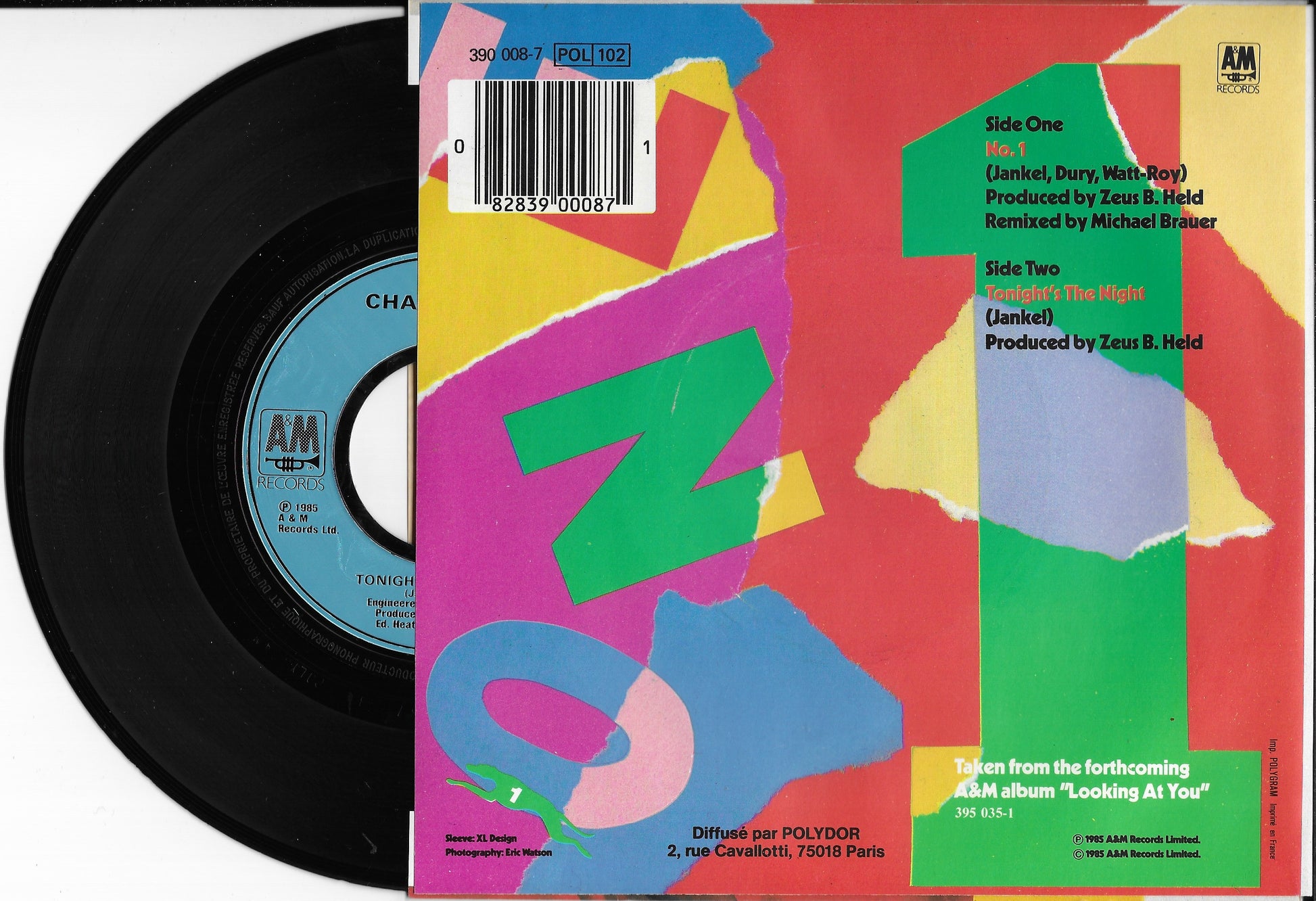 Sorti en 1985, ce 45 tours de Chaz Jankel met en avant le titre "N°1", accompagné de l'efficace "Tonight's the Night". Figure emblématique de la scène funk et new wave britannique, l'ancien bras droit d'Ian Dury livre ici une production électro-funk sophistiquée, marquée par des lignes de basse hypnotiques et des arrangements de synthétiseurs avant-gardistes.